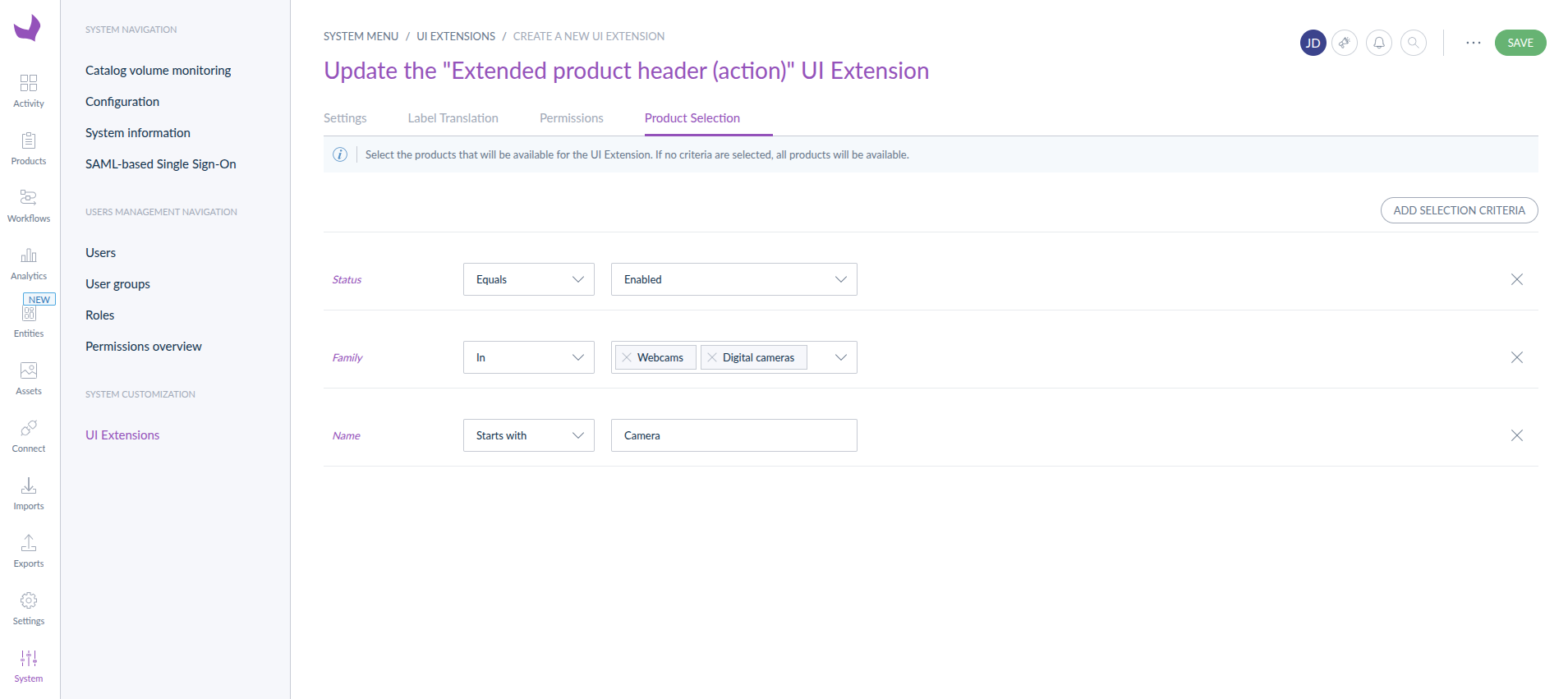 Product selection filtering uses the same interface as other Akeneo product filters, allowing you to build complex rules based on families, categories, attributes, and more.